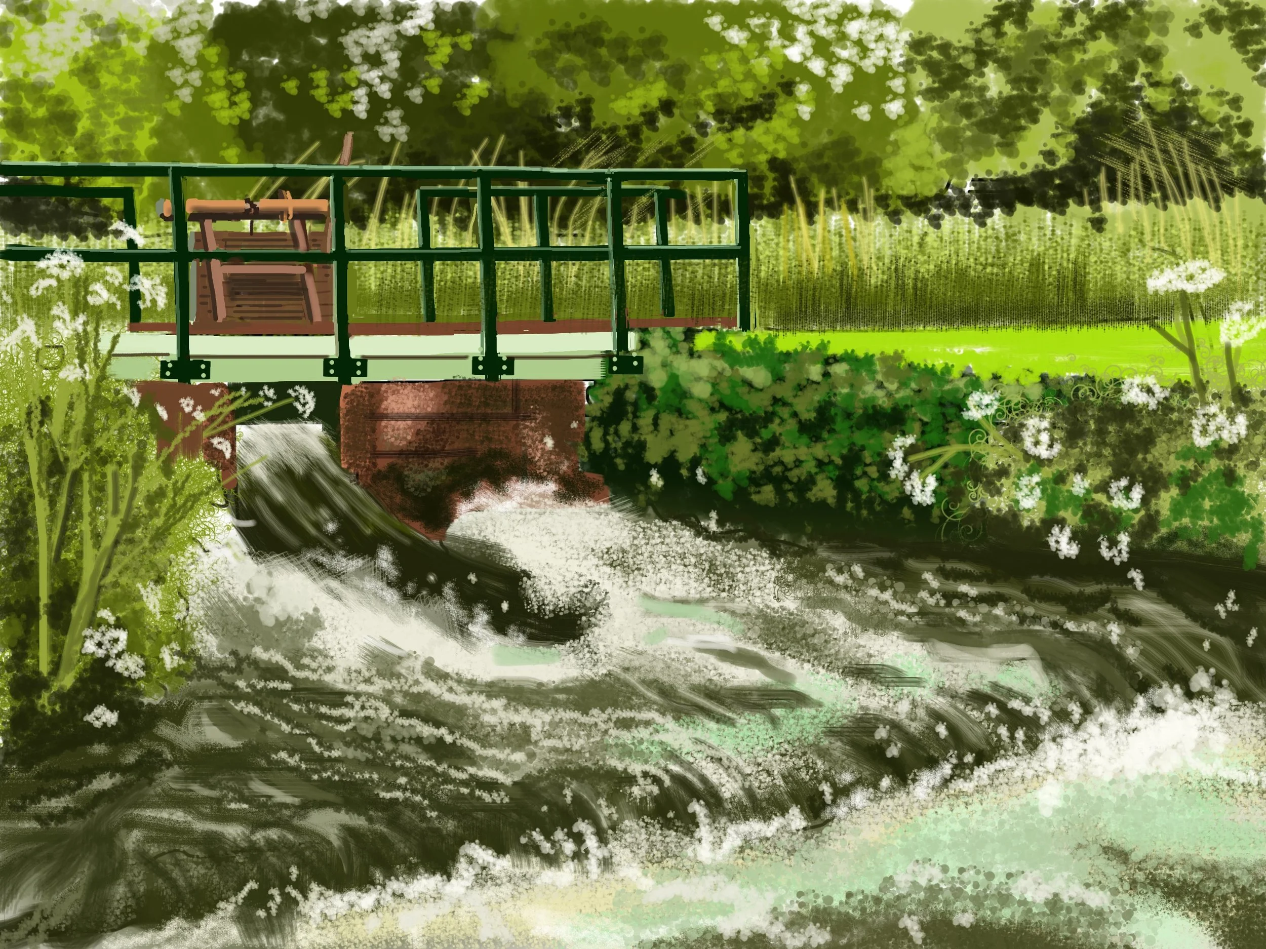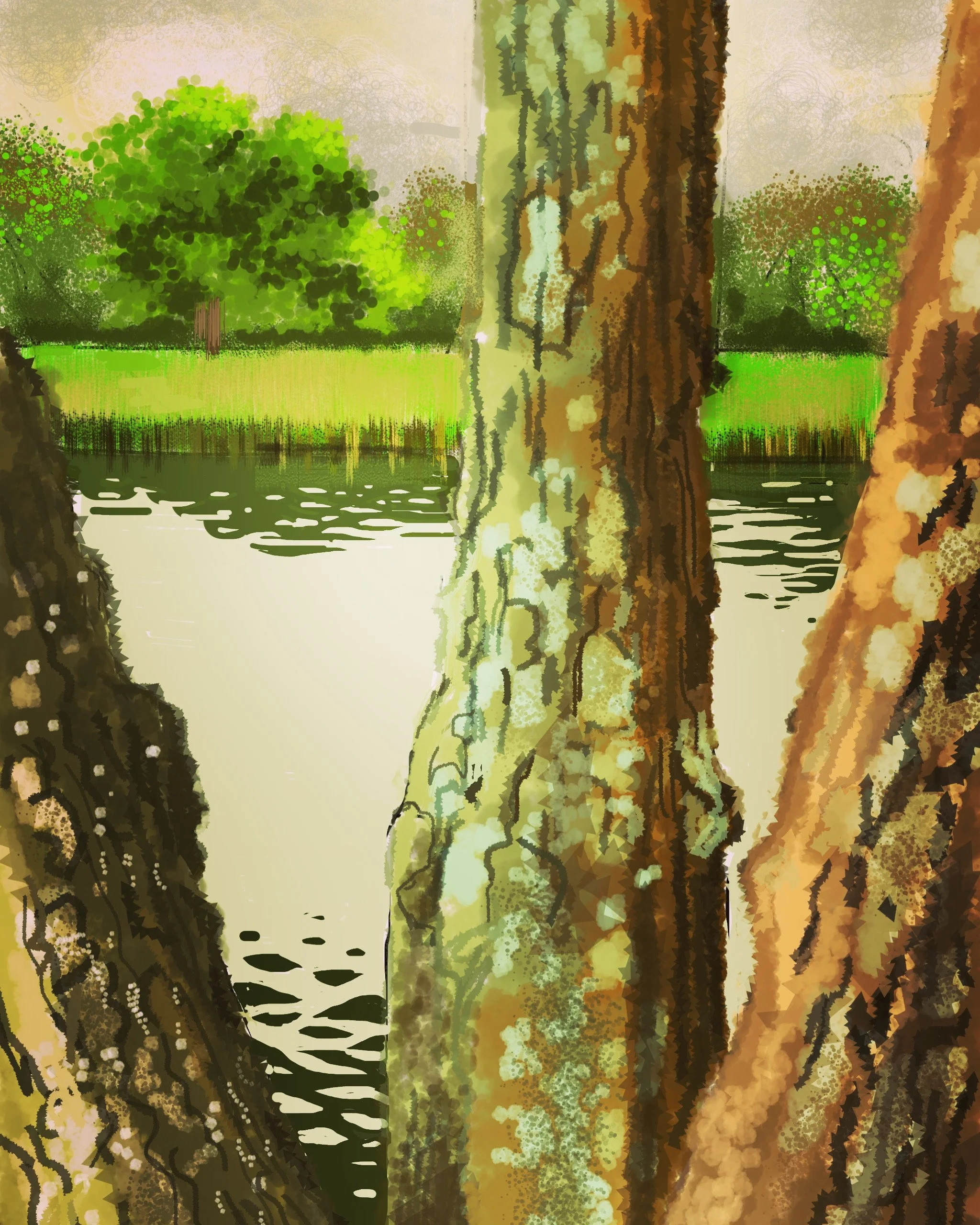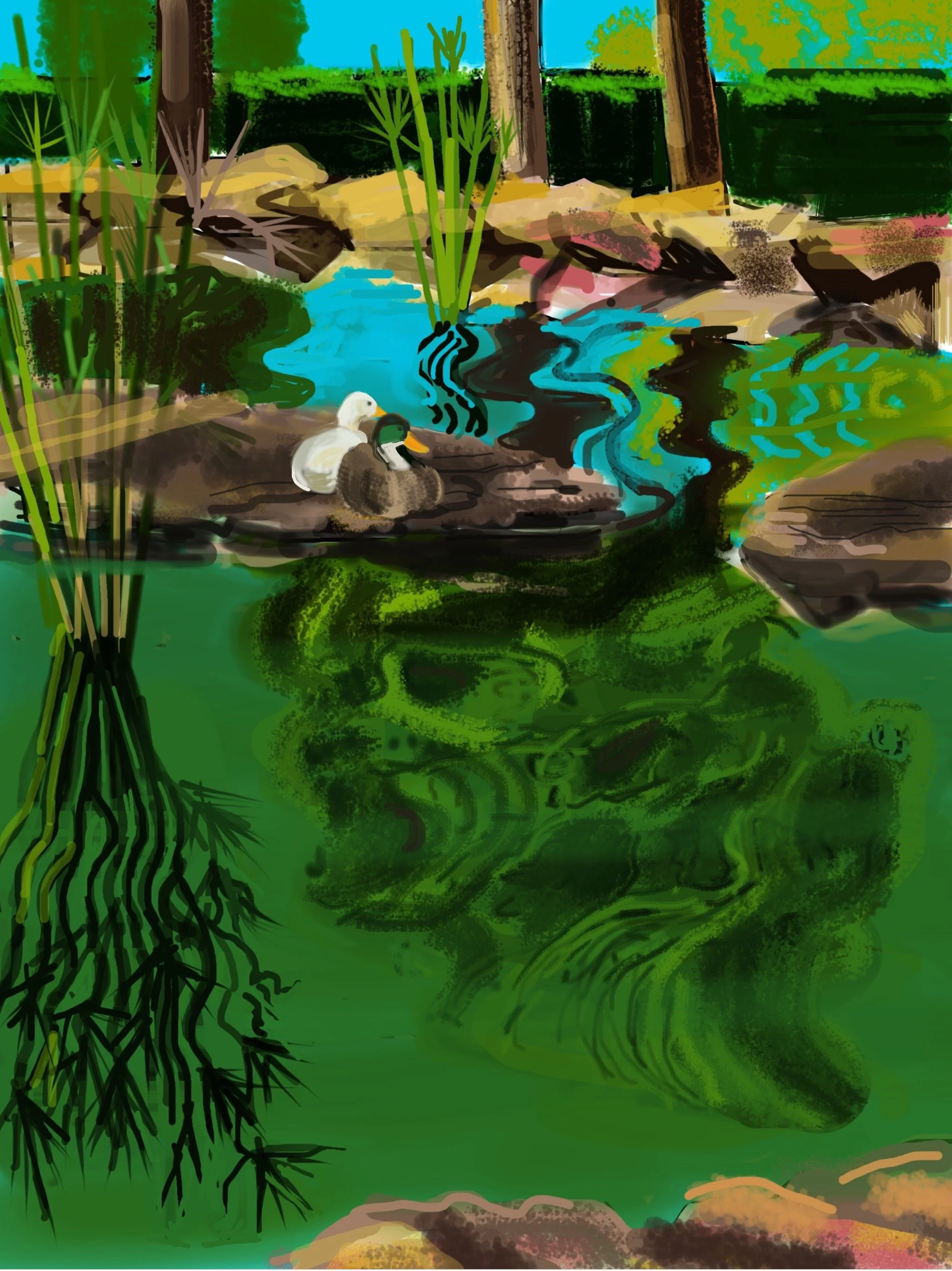 Inspired by David Hockney’s work, I do all my pictures on the iPad using the Brushes App. I prefer to work “En Plein Air” because I love being immersed in nature. I try to adapt as quickly as possible to changing light, reflections, shadows, and atmosphere. This is quite a challenge. I love it when it comes together successfully.