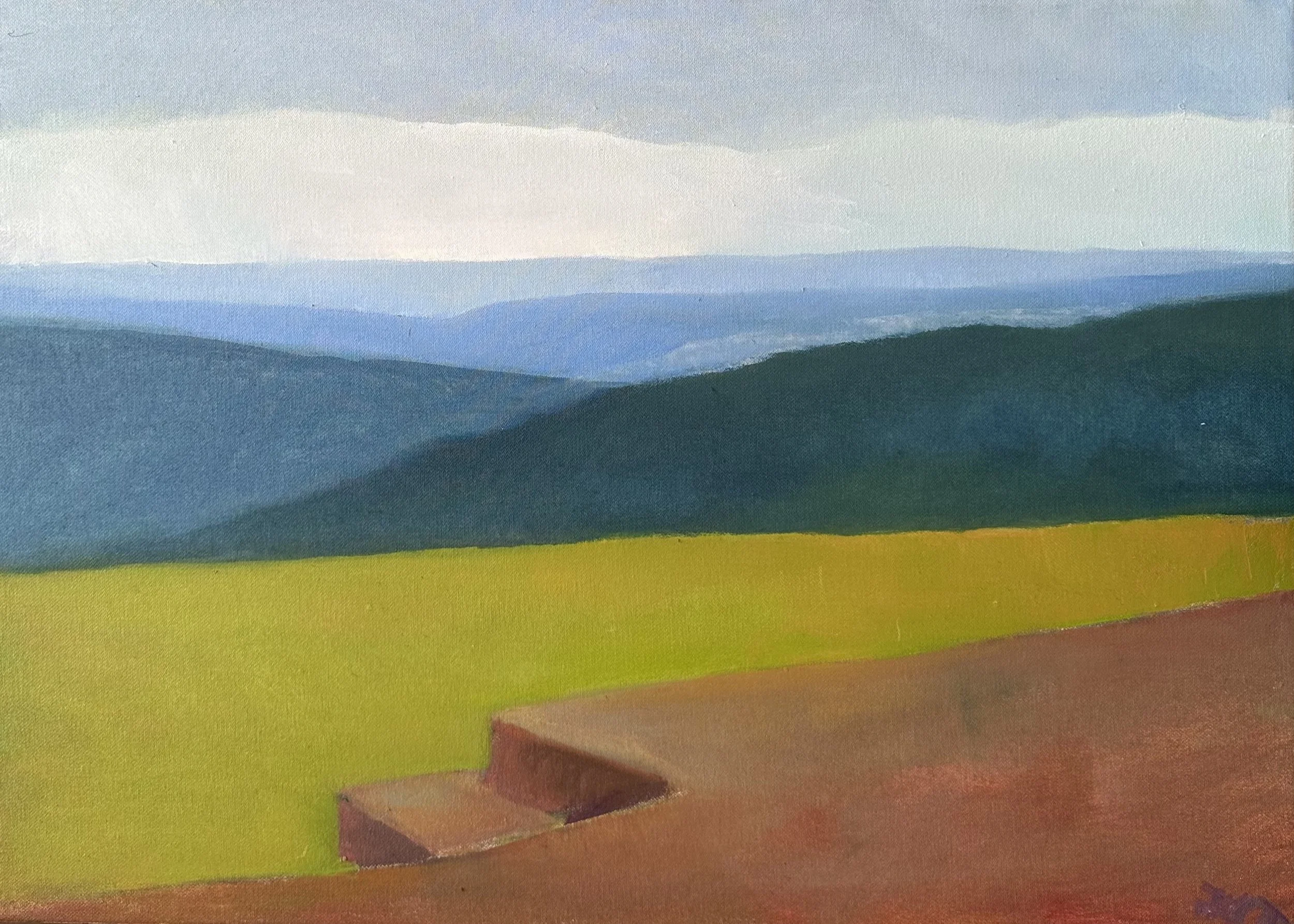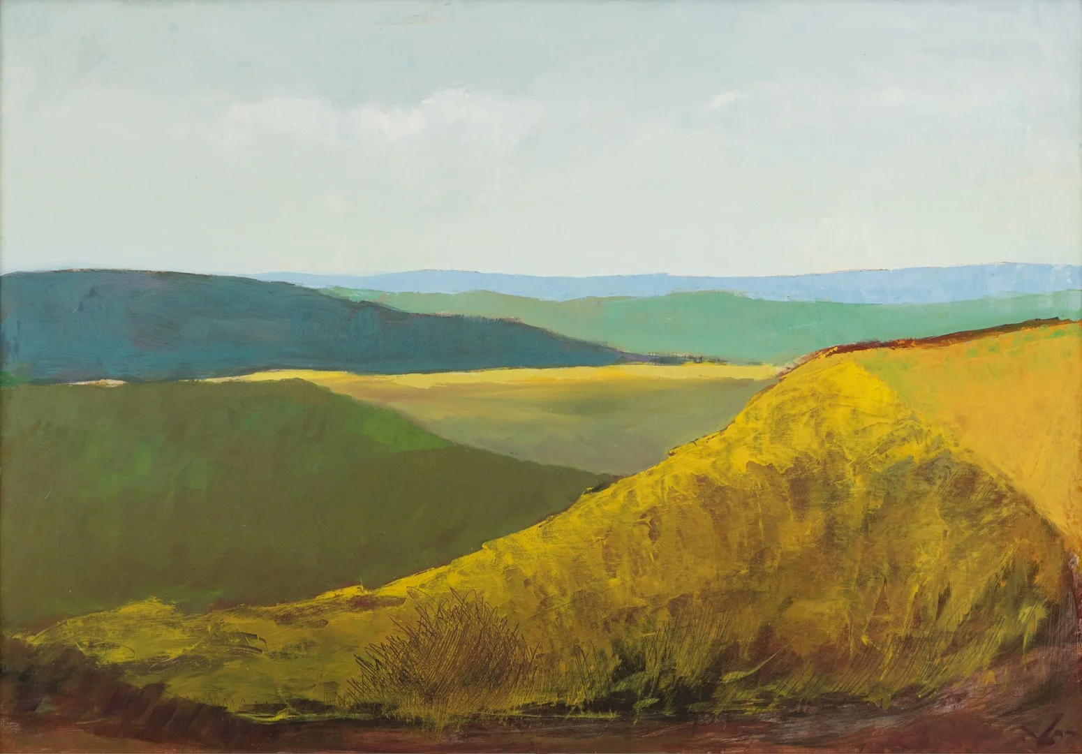 Dita jacobovitz paints landscapes. You could say one view, starting from observation even though the landscape has been familiar to here for almost four decades. This repeated investigation, as an act of meditation, instills peace with hope.
