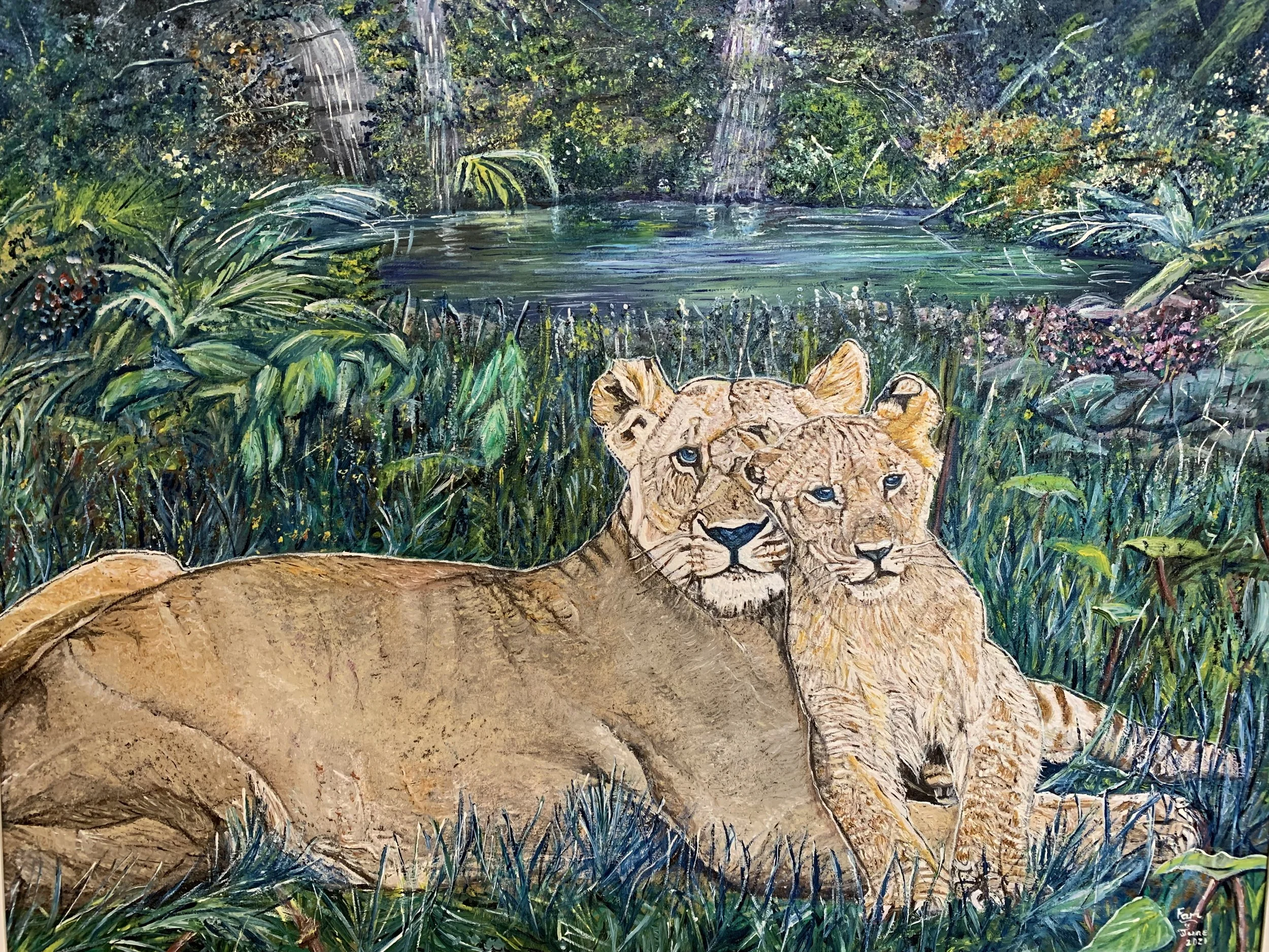 Lioness and cub, 2021, Oils on canvas, 61X76 cms
