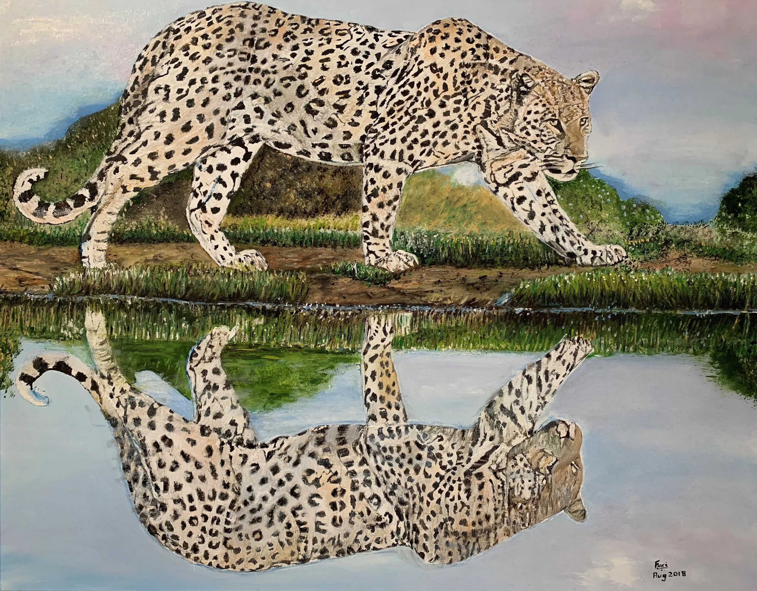 Leopard in reflection, 2018, Oils on canvas, 61X76 cms