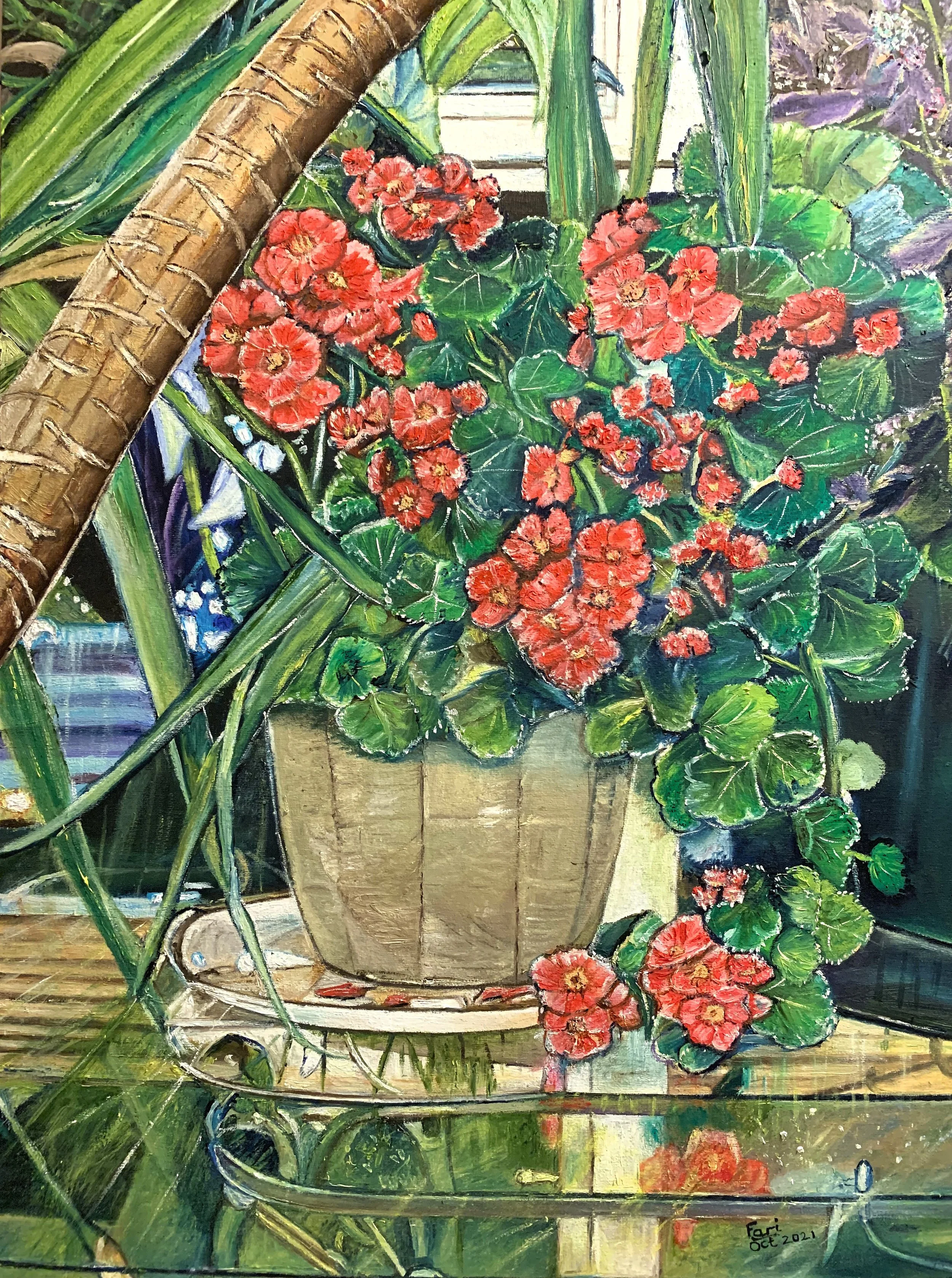 Pot of Red Flowers, 2021, Oils on canvas, 46X61 cms