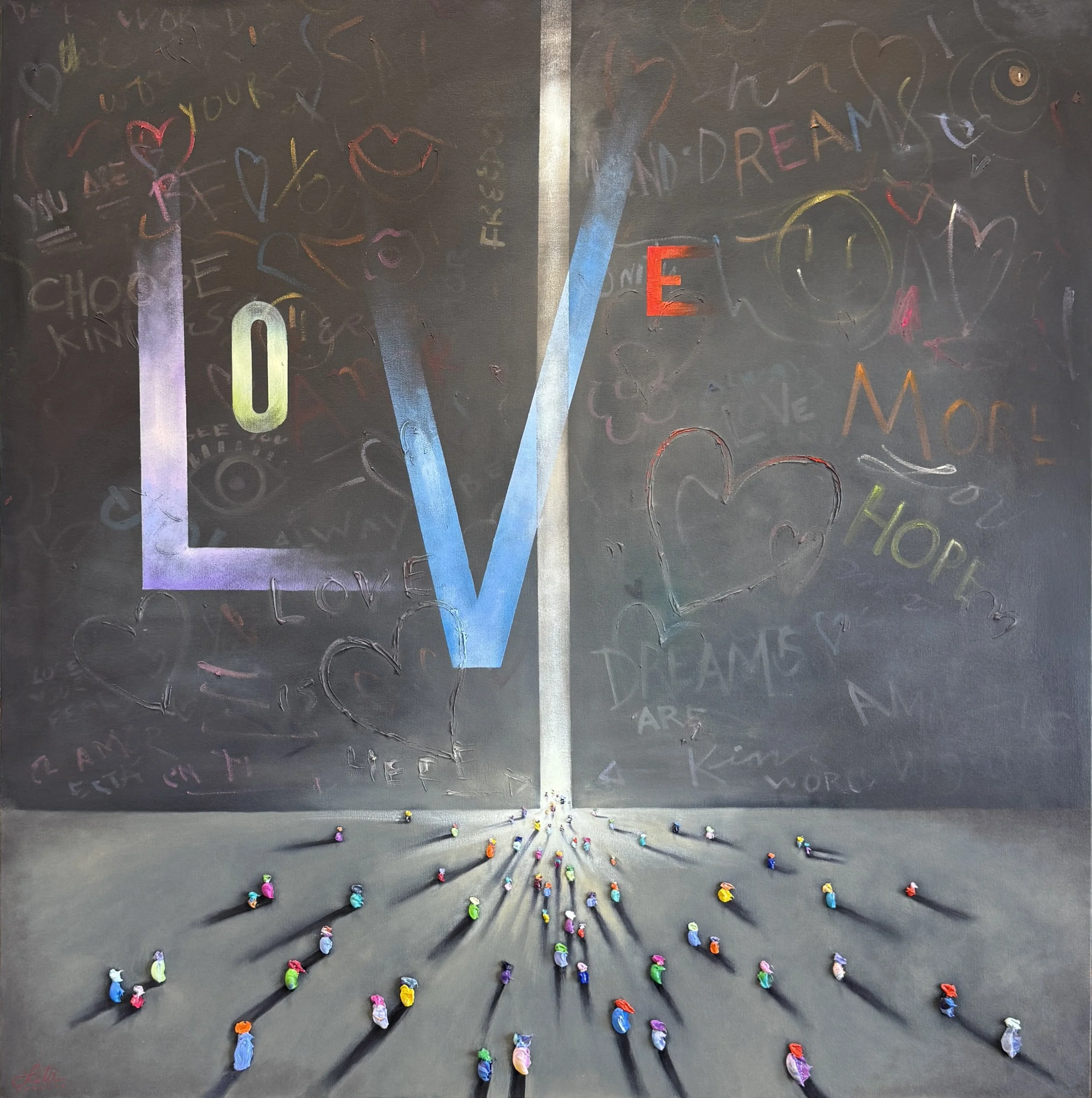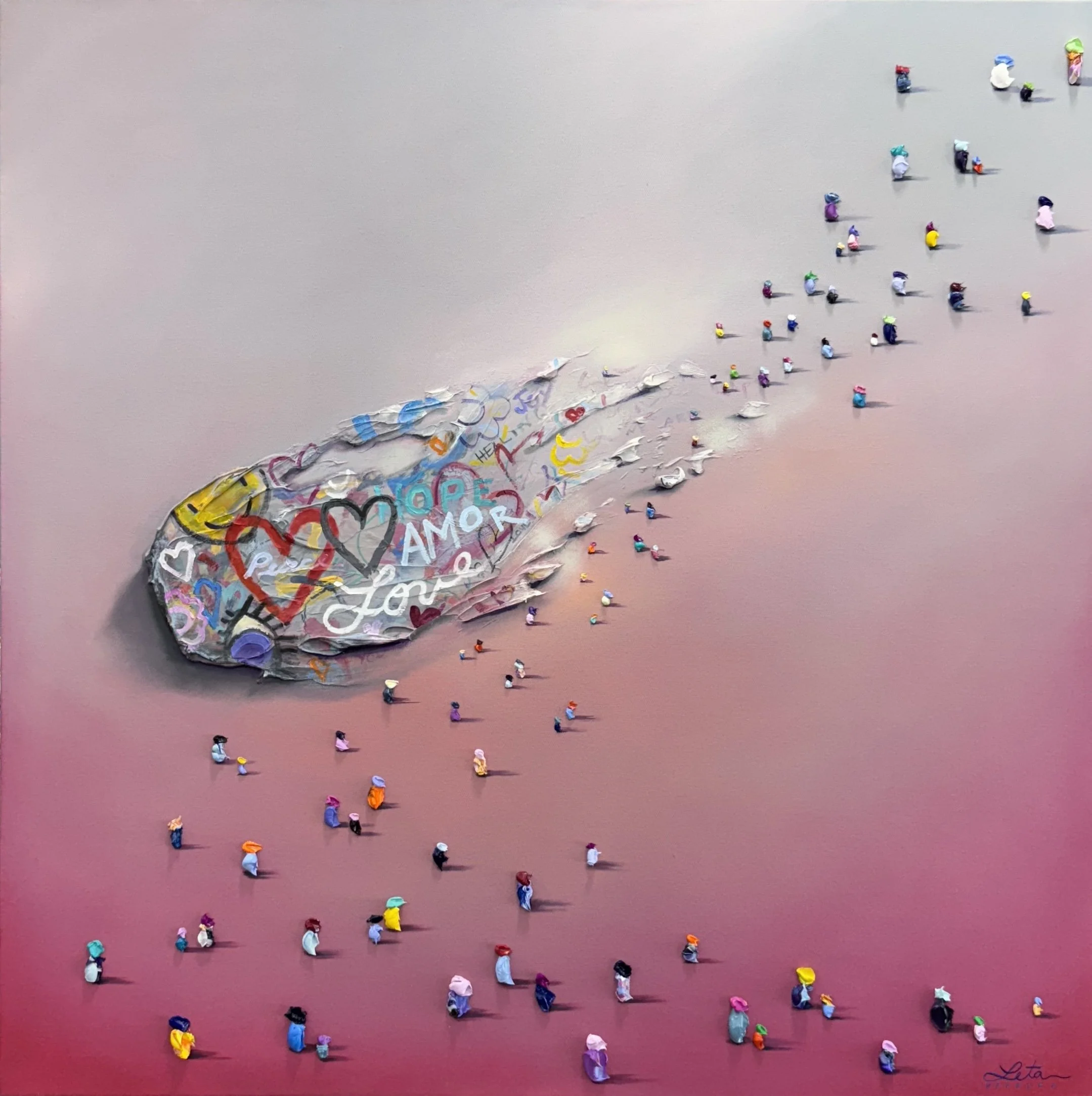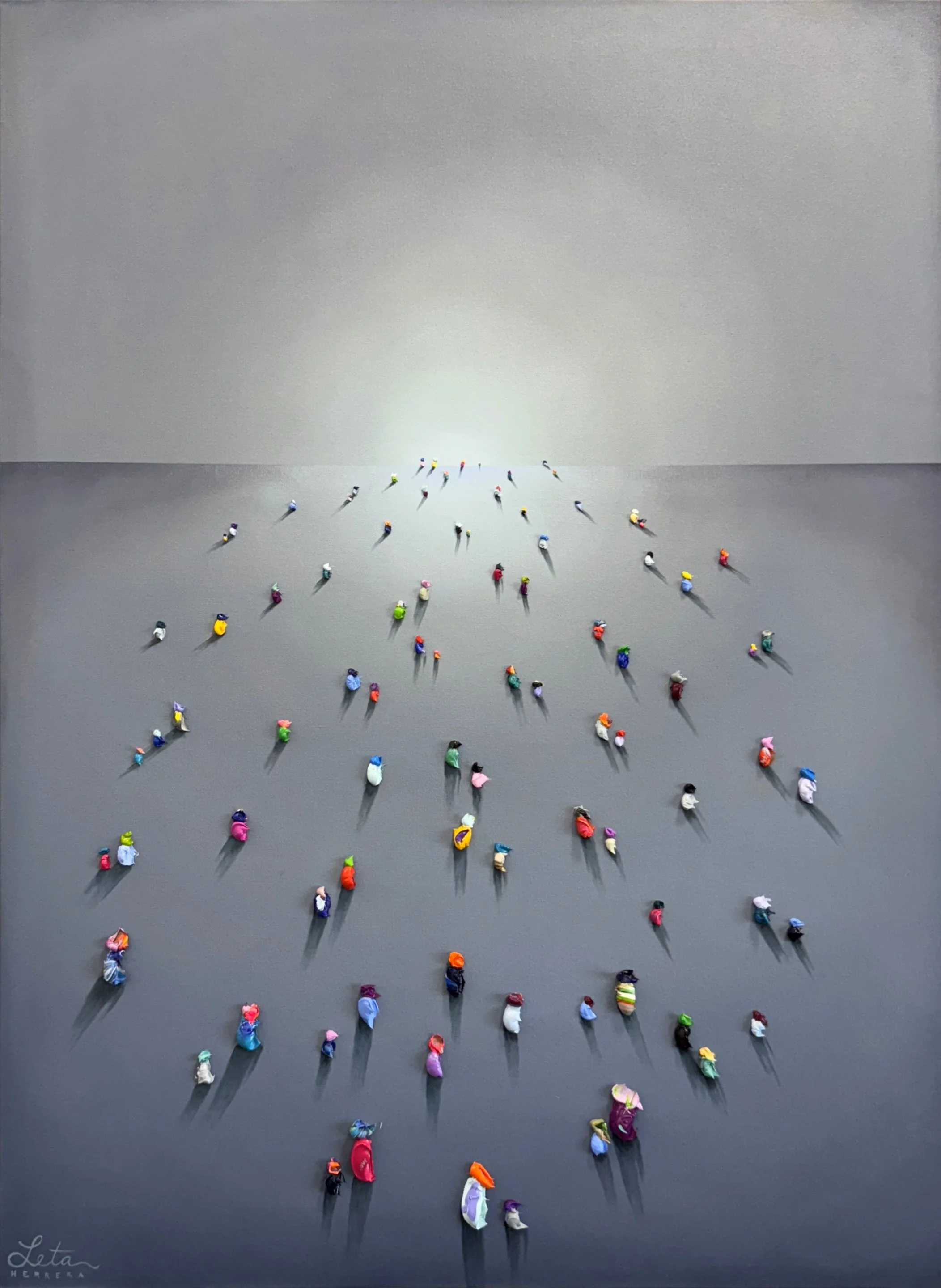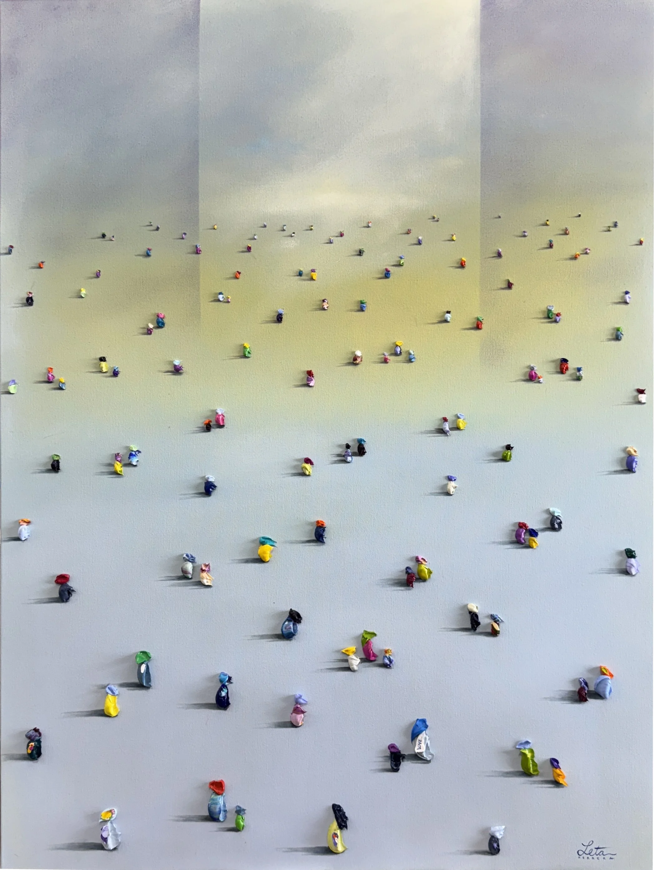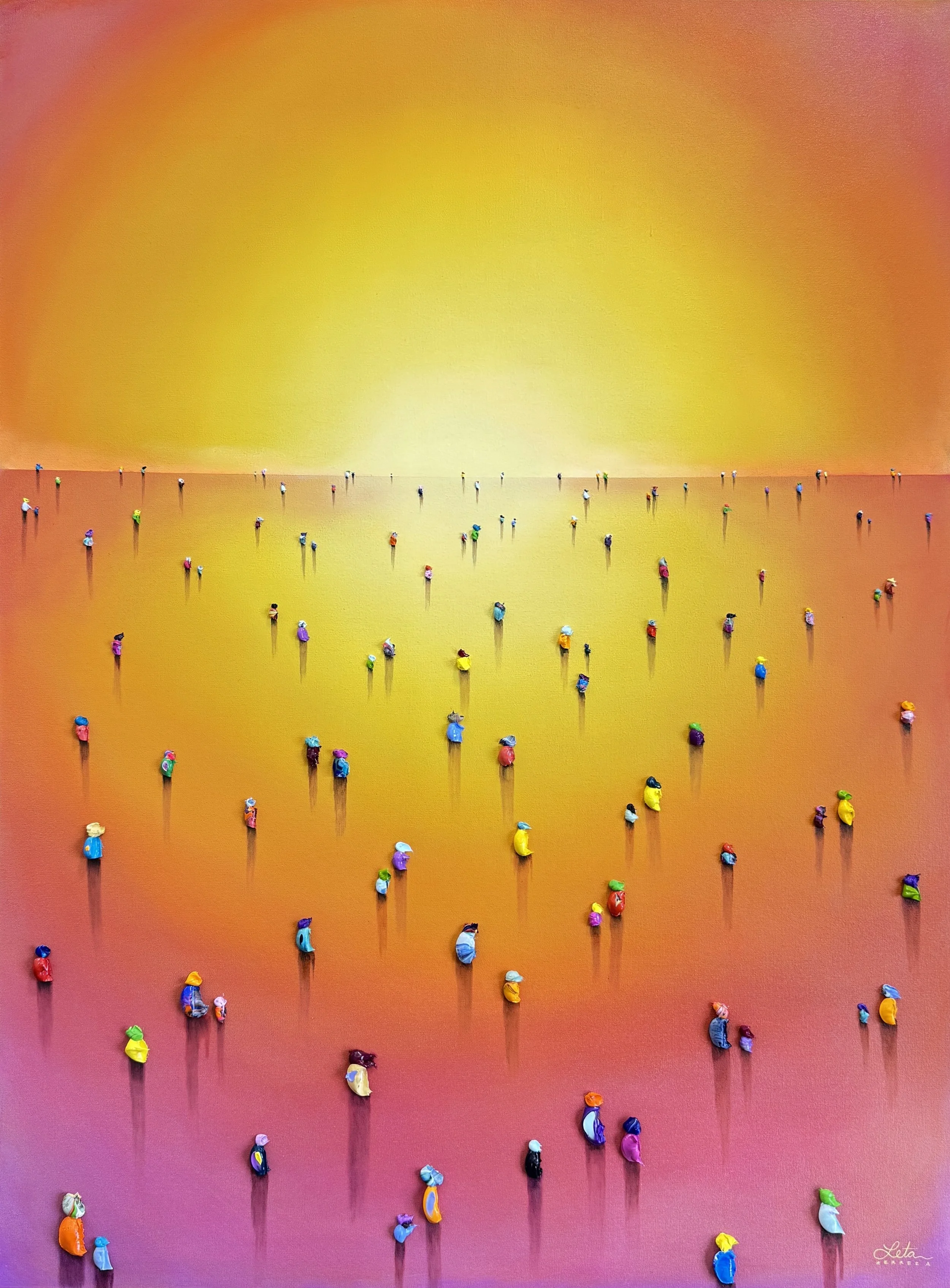 Her signature work is represented by her “WALKERS” magic surrealism series that represent a metaphorical journey, the shared search for answers that unites humanity. "Walkers" series is a striking visual narrative that explores the multifaceted journey of humanity through a vibrant and textured tapestry of oil impasto. The series, a collection of paintings featuring diminutive human figures set against vast, often gradient backgrounds, speaks to the profound search for identity, purpose, and connection that defines the human experience.
