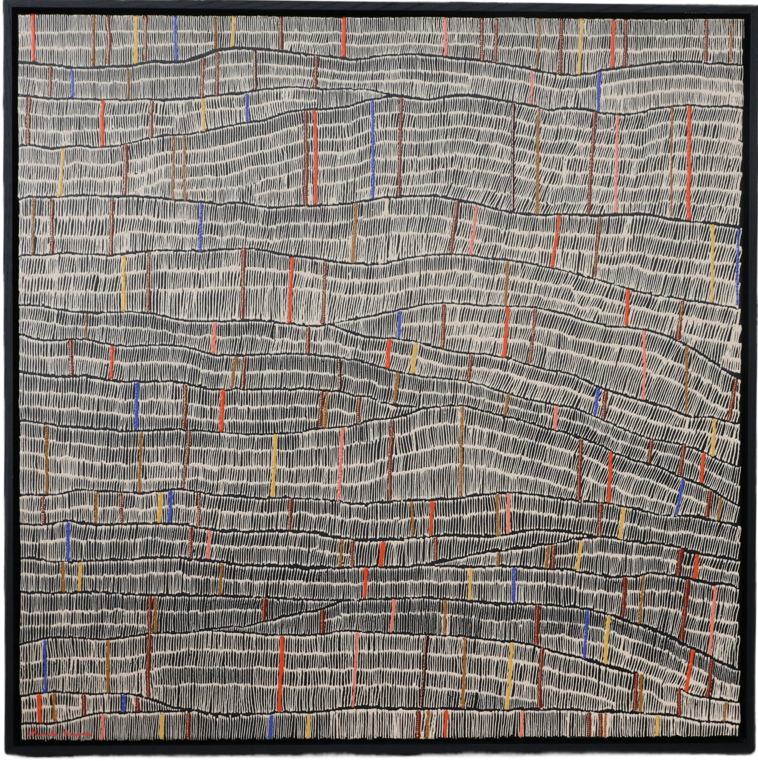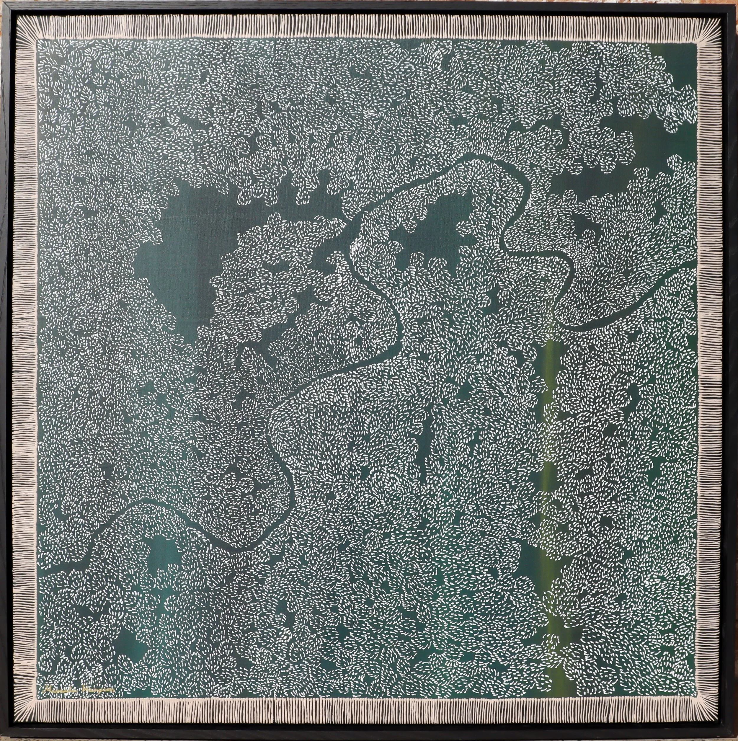Hampson’s practice is grounded in creating works based on the human experience with the aesthetics that connect her to her childhood, nature and culture. Being an Anaiwan woman, with a background in cultural heritage management and archaeology, Hampson aims to paint a landscape of Country that creates a new dialogue about how we move forward as First Nations people in all of our diversity. Whilst she expresses her narrative as an individual, there are a number of shared connections experienced by First Nations people, framed by common themes including kin, Country and the importance of place.