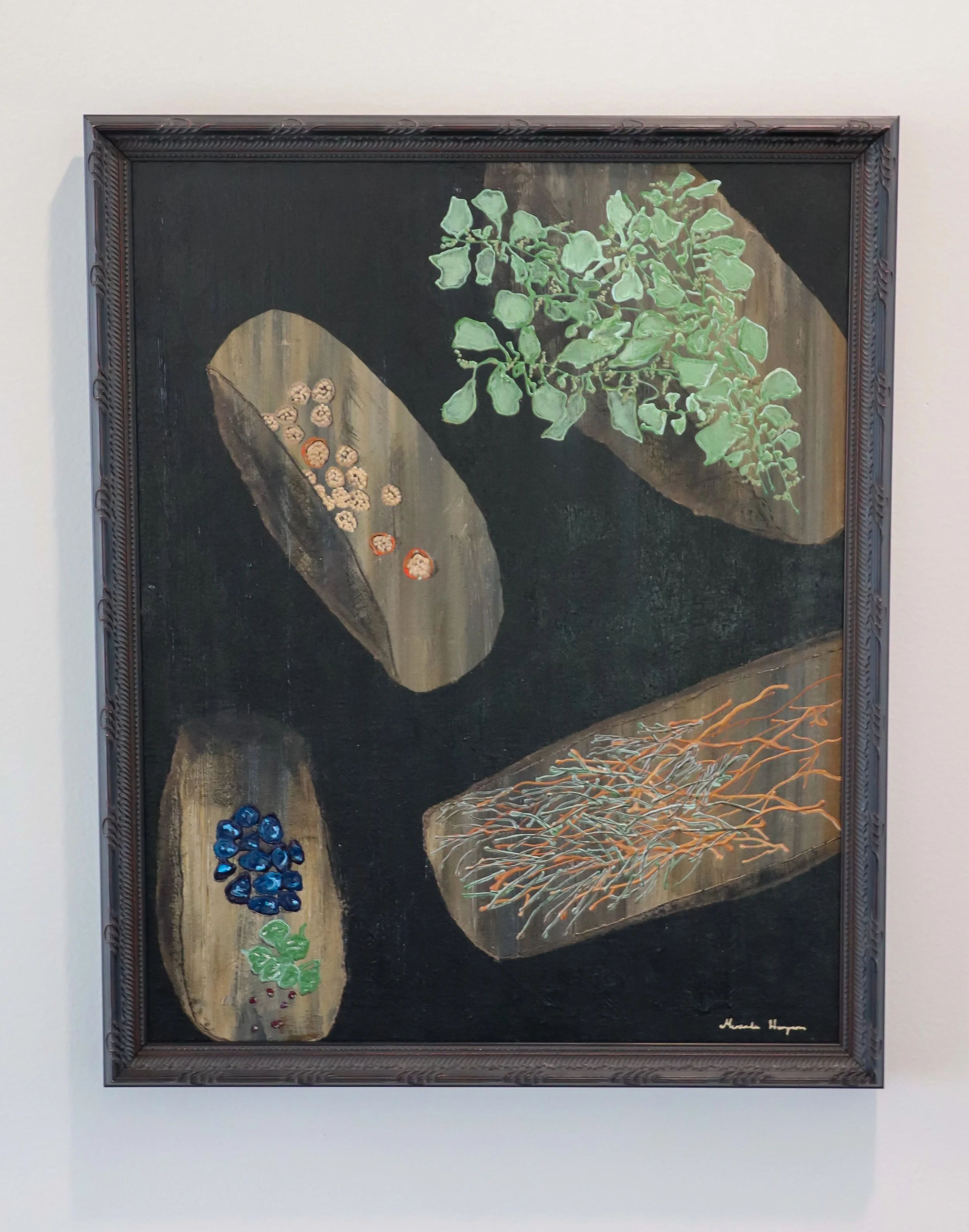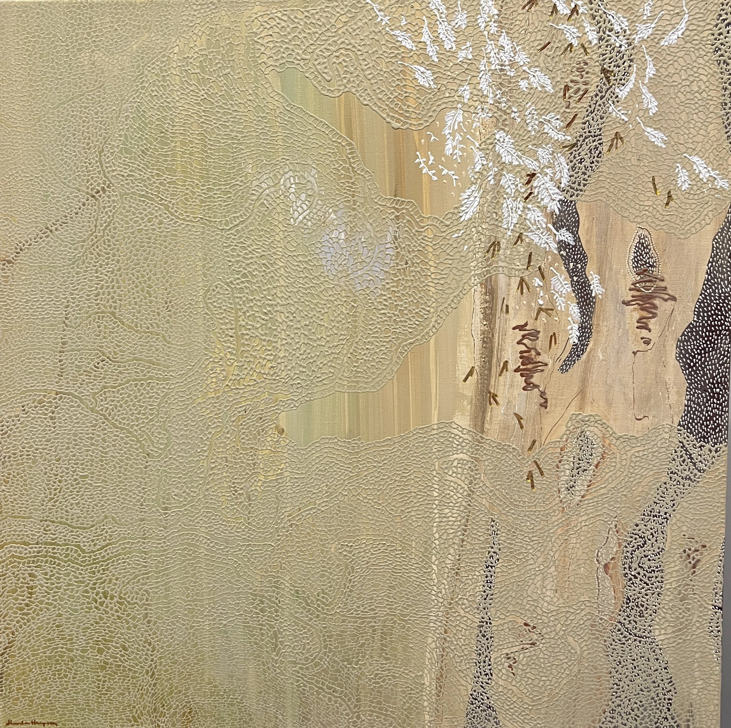 SHELLS BECOME SPARCE AS ELDERS PASS, 2024, acrylic on cotton, 50x40cm