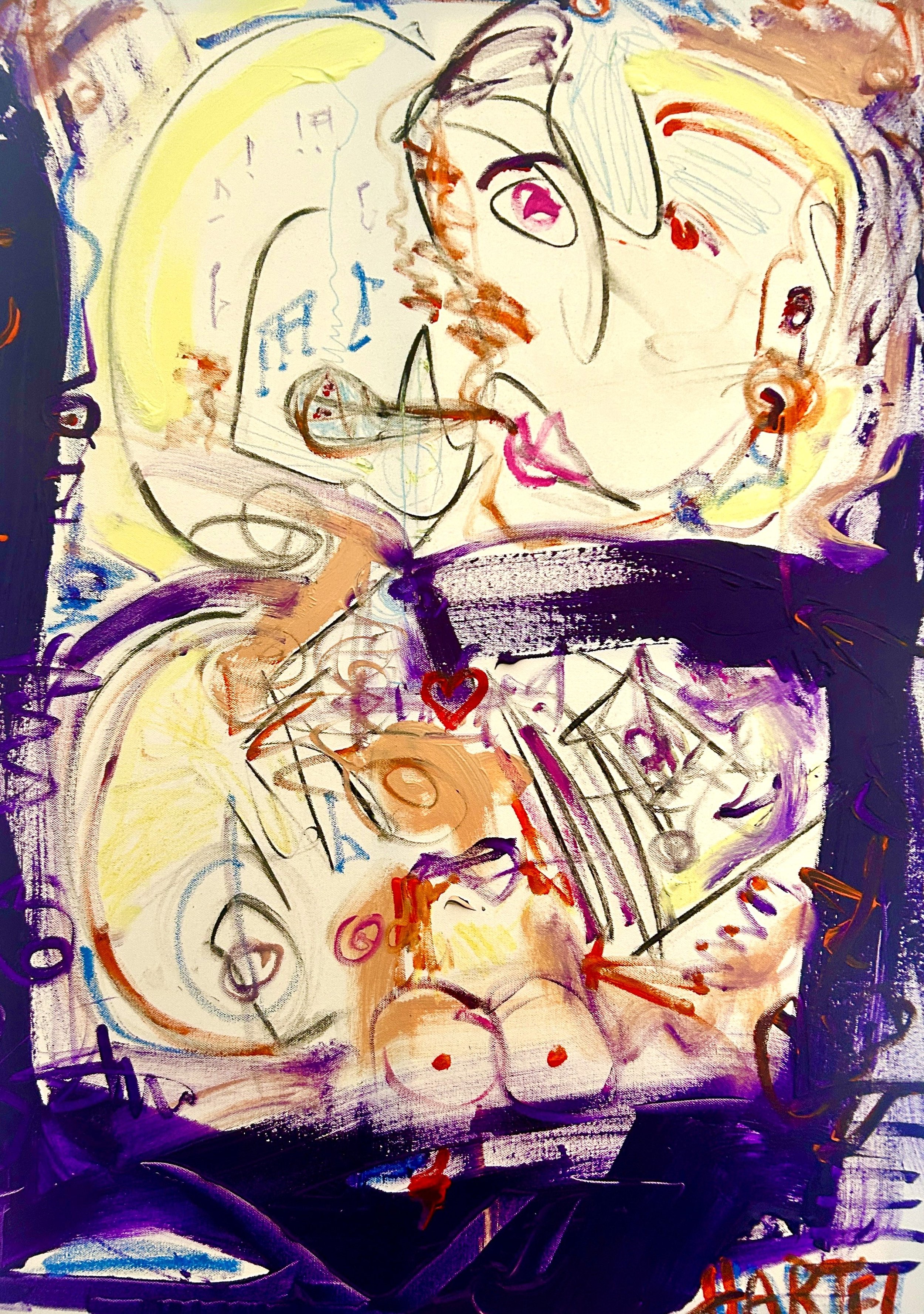 His creative work celebrates a pure, uninhibited essence while also serving as thought-provoking commentary on various social and existential issues. It is delivered through an energetically raw and improvisational approach. Hartel’s art bears witness to an unfiltered truth untouched by doubt or reservation. He is driven by an unmitigated sense of urgency, mirroring the vitality of life and all its complex intellectual, emotional, and existential fluctuations.