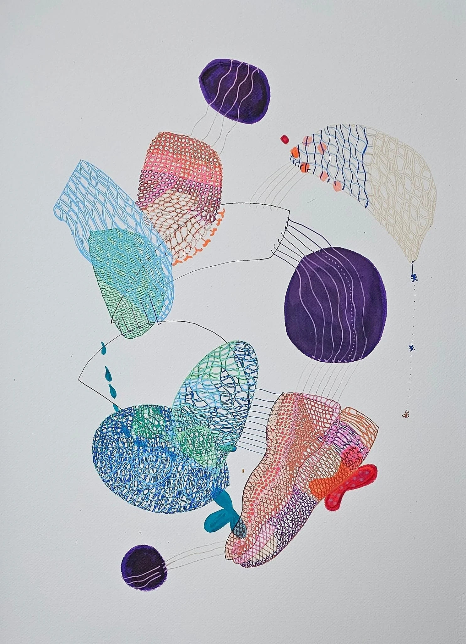interwoven fluidity,2024. Freehand mixedmedia drawing on acidfree 300lb watercolor paper,71.12 x 55.88cm.12 cm
