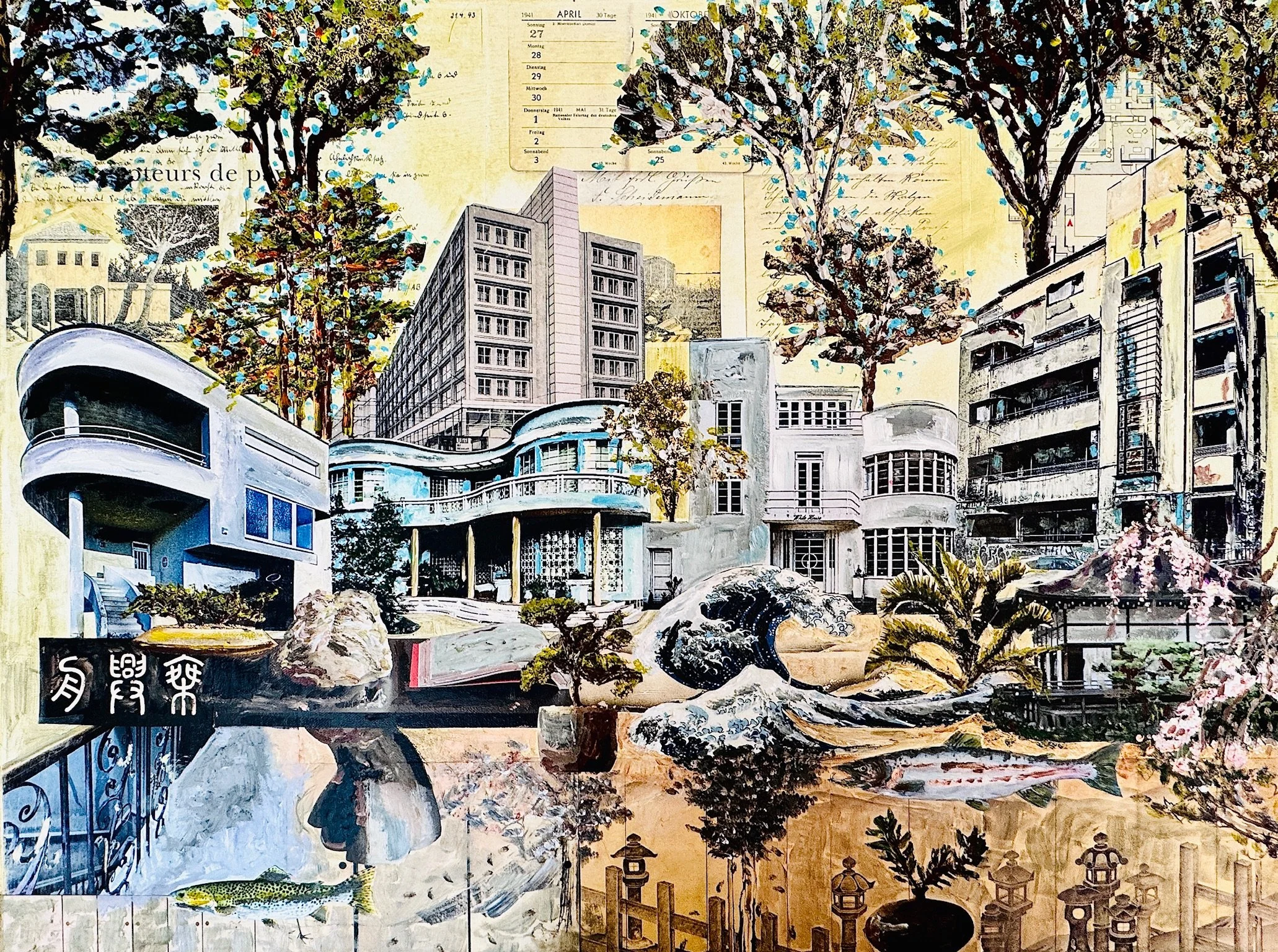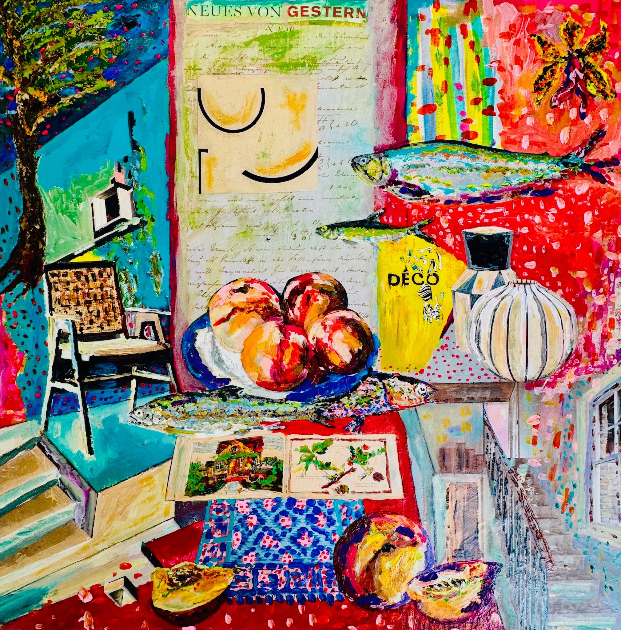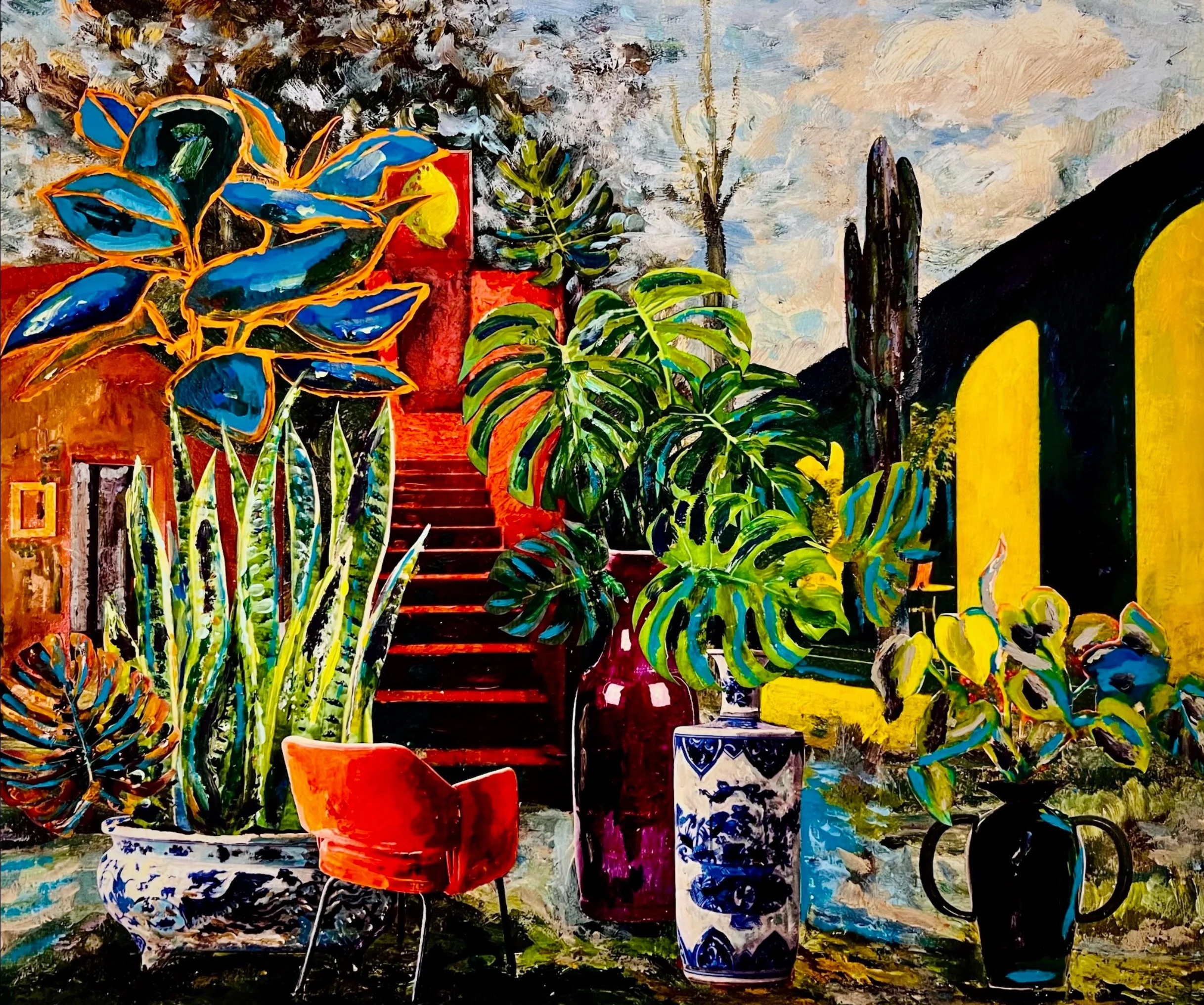 “My artistic practice centers on the imaginative transformation of interiors into vibrant, multi-layered sanctuaries that invite viewers into new perceptual realms. Drawing on a deep engagement with art history and a lifelong exploration of composition, color, and symbolism, my work transcends mere decoration. Instead, I assemble diverse elements—collage, flora, fauna, and historical references—into striking, tapestry-like settings that feel both familiar and unexpected.” This intention is at the core of her creations, where each composition is meticulously constructed to challenge spatial perception, introducing depth and ambiguity.