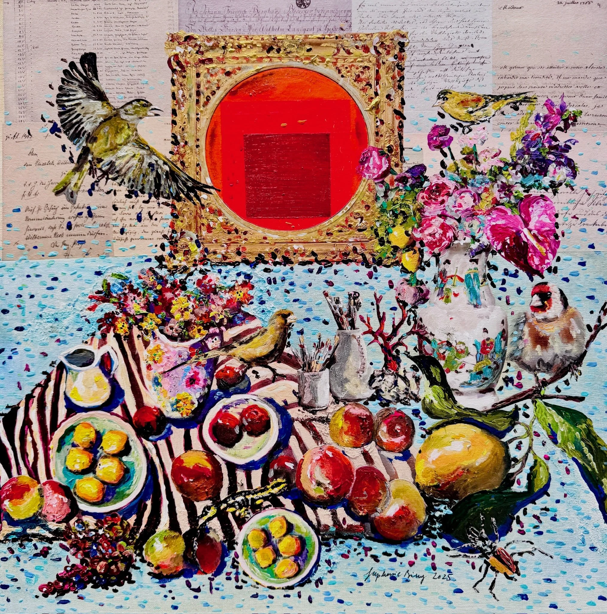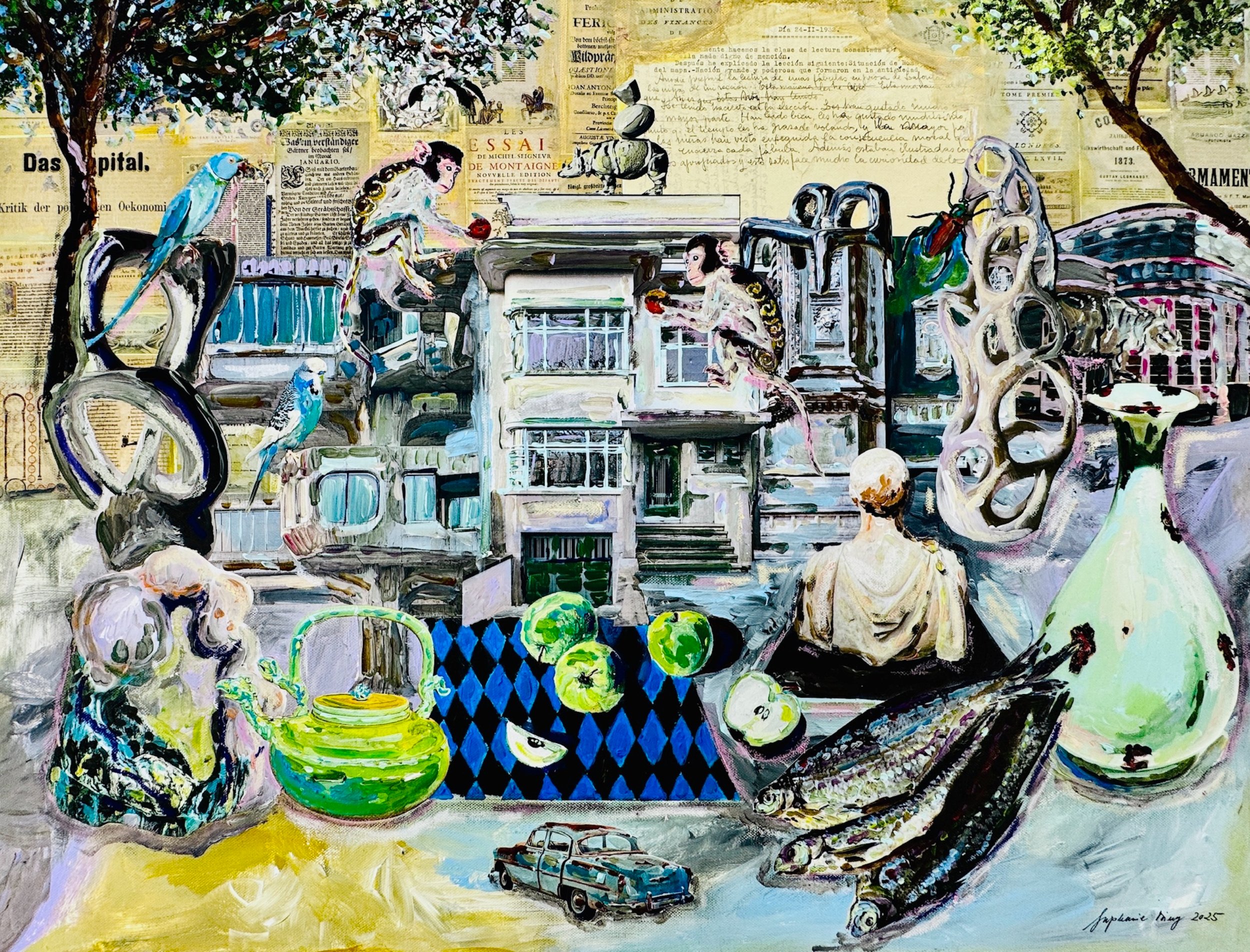 Stephanie Bing’s lyricism skilfully combines sensitivity with refined cultural understanding. Her methods are informed by a nuanced contamination between the immediate, the mundane, and the timeless: she draws inspiration from daily life, details, journeys, and a dialogue between classical culture and contemporary art and design. Energy, rhythm, and contrast merge within every work, infused with symbolism and attention to detail. “My paintings challenge conventional spatial perception, introducing depth, narrative, and ambiguity while exploring themes of resilience, creativity, and personal metamorphosis. I aim to create environments infused with high energy and joy, encouraging the viewer to experience wonder, emotional resonance, and visual delight.”