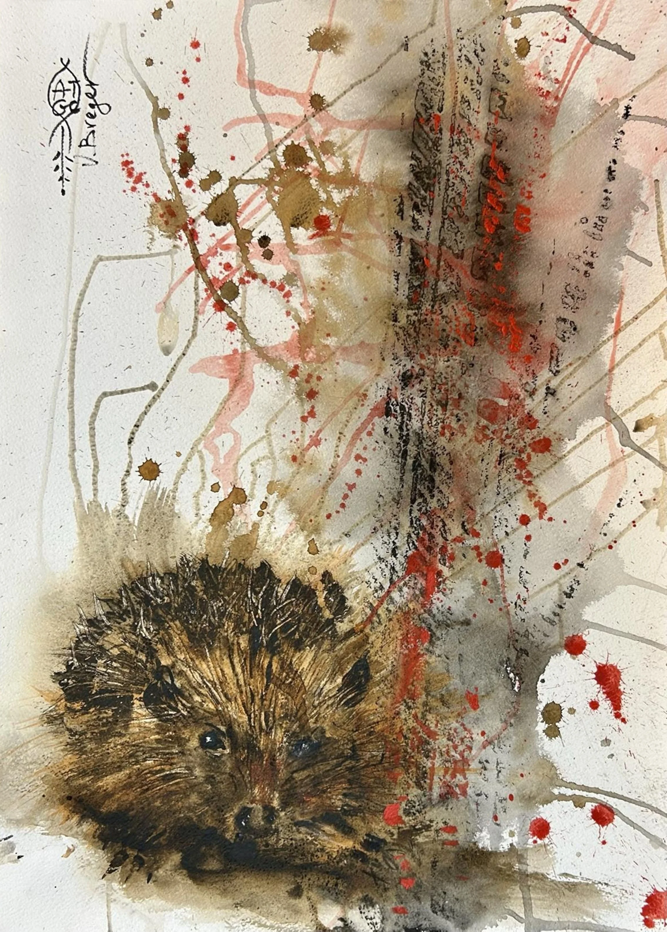 "Civilization ignores the elegies of Mother EARTH," Varda Breger explores in her paintings and poems (in Hebrew and English) ecology and social life on our vulnerable planet. She uses mixed media, including transparent and opaque elements, primarily on paper. Streams of spontaneous running paint cages a blurred deer, rudely trodden upon by her shoe or a car tire. An elephant with a broken task emerges from chaos. An abused nude body of a woman, her head hidden with a fig leaf, and a knife and fork beside her to remind us of murder in the family. The threat of nuclear weapons is always on her mind (MSc. Chemistry, Tel Aviv University & BSc., Technion, Israel). The atrocities and the cruel war in my own country, in Ukraine, and other places drive her to act for Peace with her tools. Inspired by the return of migrating birds at the revived Hula Lake, she wrote: