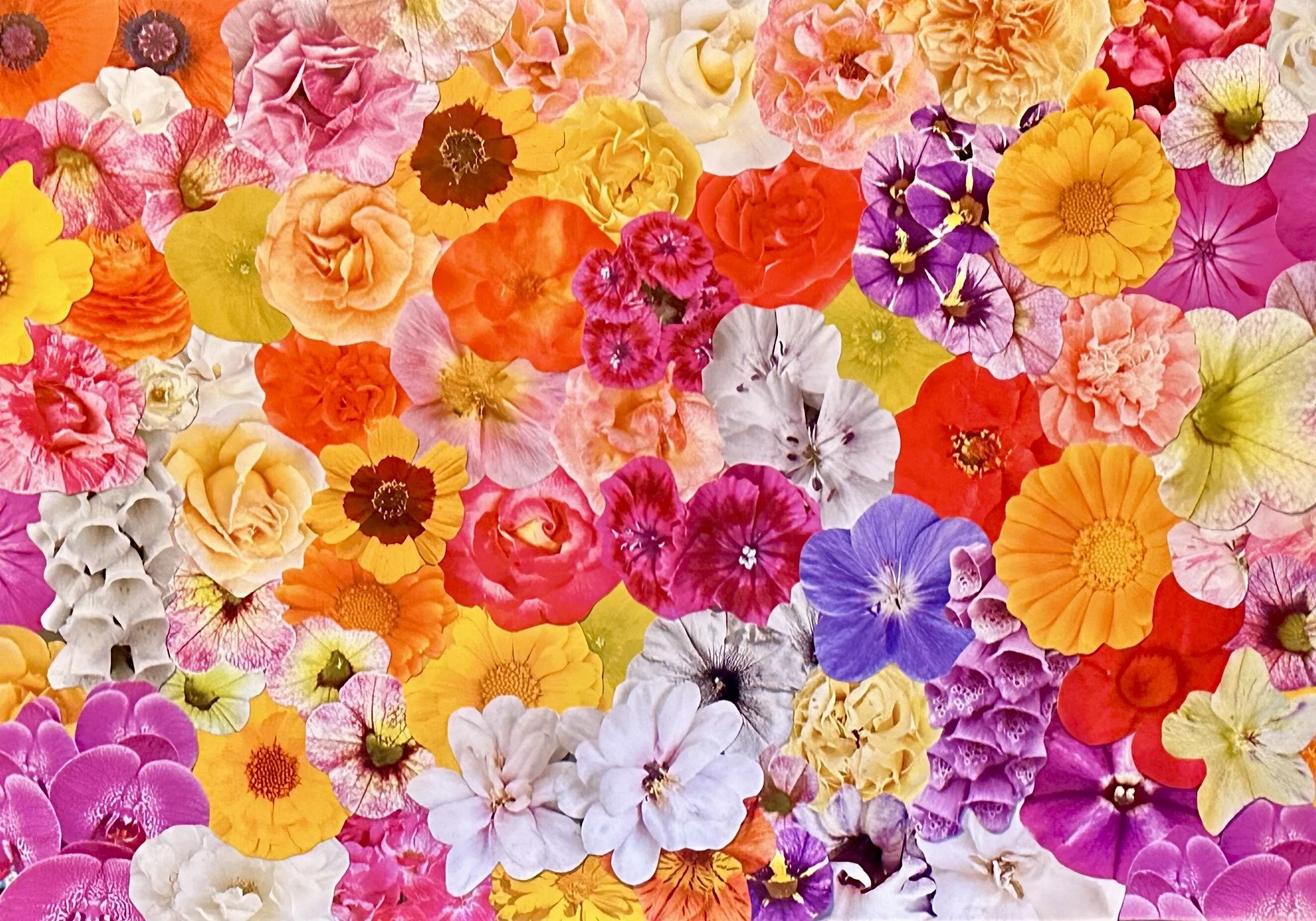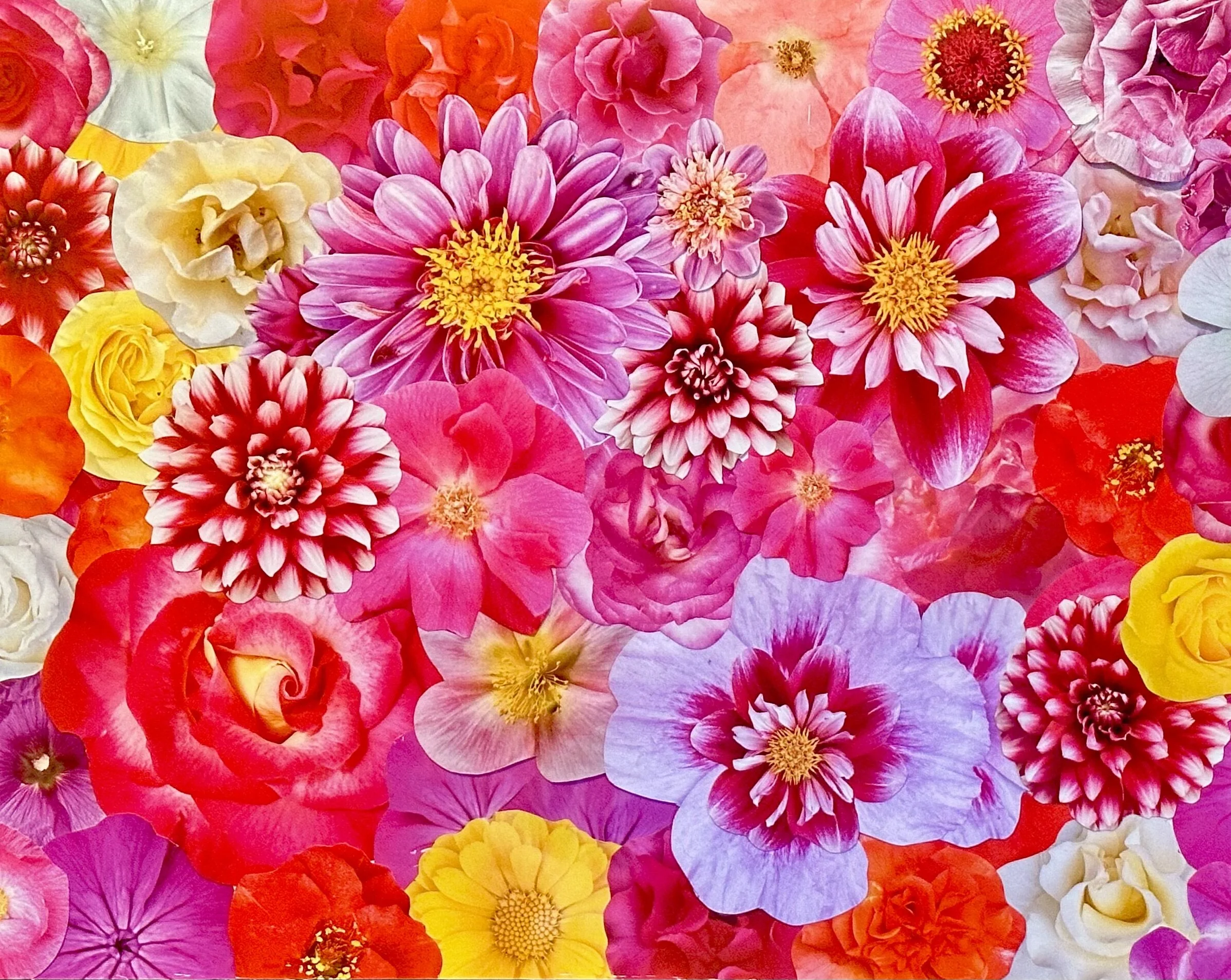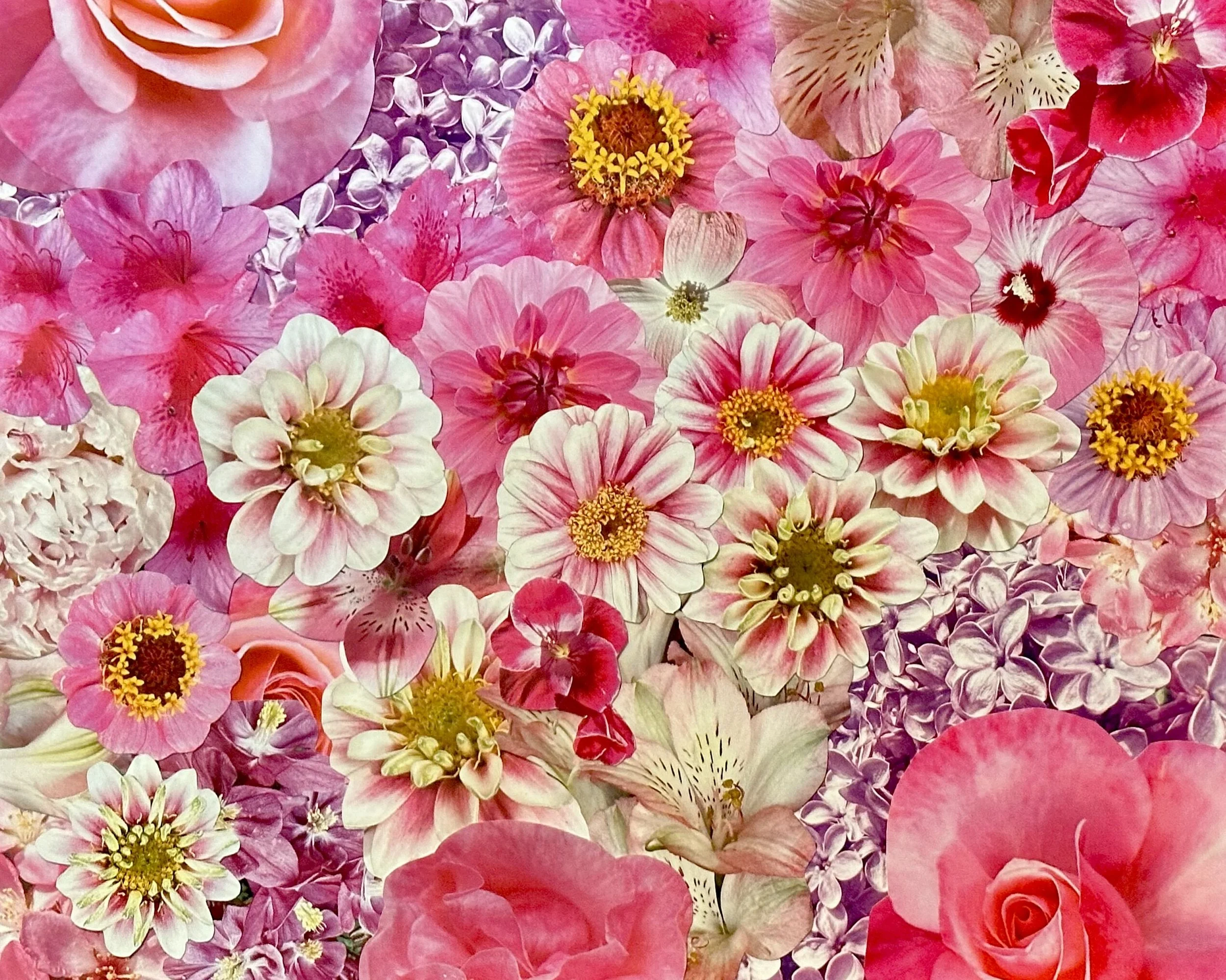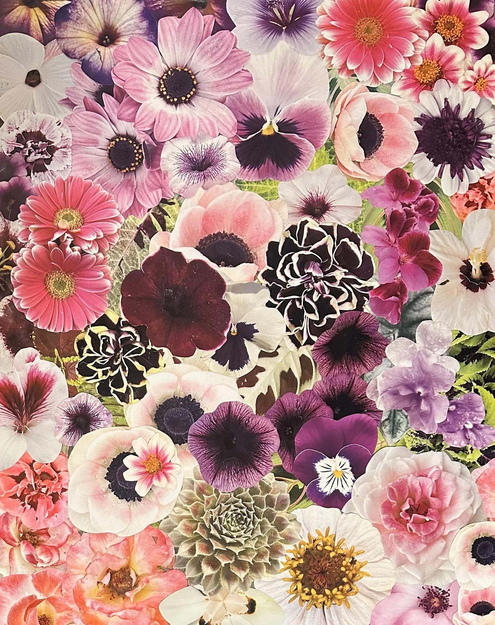 Kat began by specializing in floral collages, because the individual flowers combine to create a new and cohesive form, reflective of the healing process. She takes her own photographs, which is important to Kat, unless a photo is donated by a personal friend. Each image is hand cut, a process she calls meditative, and a single photo collage may require dozens of flowers, succulents and/or leaves.